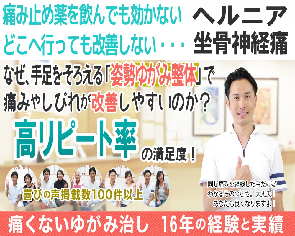 当院では、腰椎椎間板ヘルニアやヘルニアからくる「坐骨神経痛」でつらい腰や足の痛みやしびれで悩まれているたくさんの方が「体の歪み」を直すことによって改善されています。